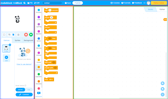 •Red: Toolbar: In this area, you can find all the options to manage your mBlock account, files, support, and additional information related to mBlock.